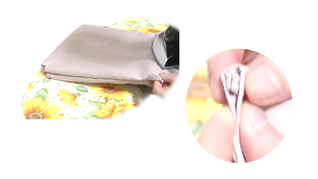 そして、ファスナーの縁をこのようなラッピングタブで覆い、邪魔にならないタブの真ん中付近をステッチ二度がけで固定(ボックス内に出ている筋のことです)。