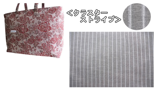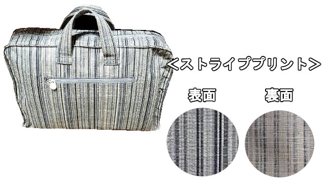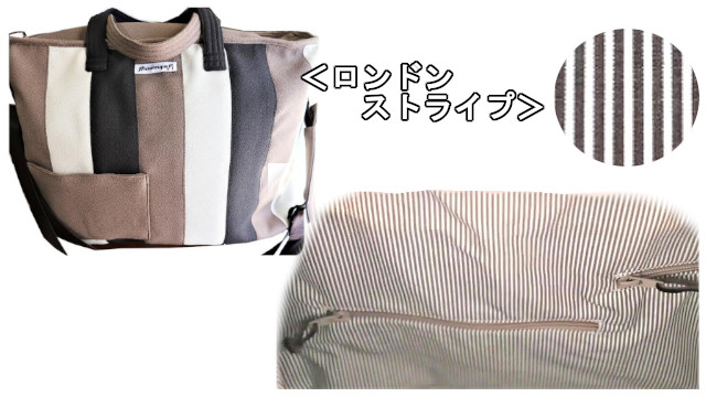 ストライプ生地は先染めのみならずプリントもある、バッグ製作ではボリューム抑えたストライプ生地は大半を裏地に使っている