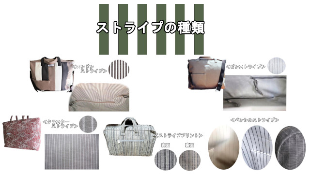 では、ここからは、過去にバッグ製作に利用させていただいたストライプ生地の使われ方というような視点で振り返ります。