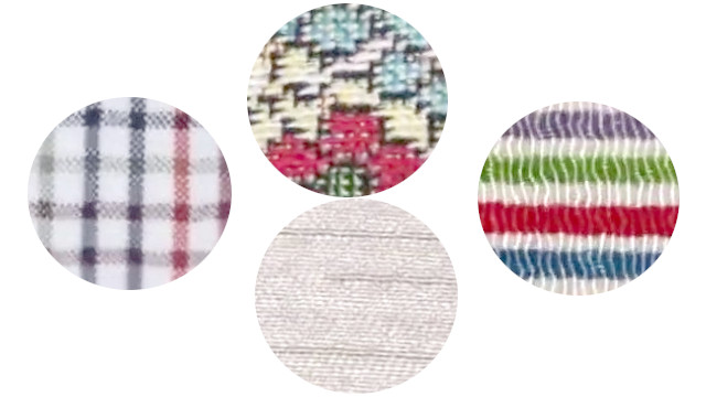 使用生地(全4種):左から右へ、左-広幅先染サッカー、綿/100%、日本製。中上-インテリアジャカード、ポリエステル/55%、綿/45%、スペイン製。中下-シャンタン、ポリエステル/100%、日本製。右-ちりめん金彩プリント、レーヨン/100%、日本製。・・・真ん中のみ表地と裏地が別生地で、左右は表地・裏地共通という意味です。