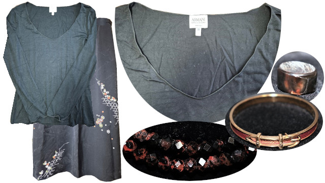 お洋服とのコーデ例:黒ベースのお洋服を抜け感を出してカットソーと和柄ロングスカートで組み合わせ。