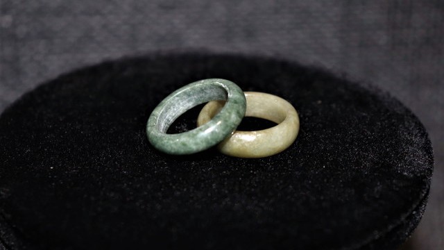 ジュエリーで起こるミラクルの1つ、ネックレスやブレスのカラー展開と同じような色味の濃淡で見つけることができた2点の翡翠くり抜きリング。