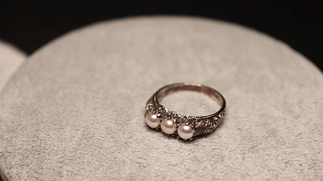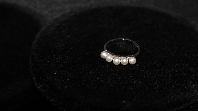 <旧34>リング(変更後):K14WG台の1粒4mm程度の あこやベビーパール5個。サイズは13号程度。