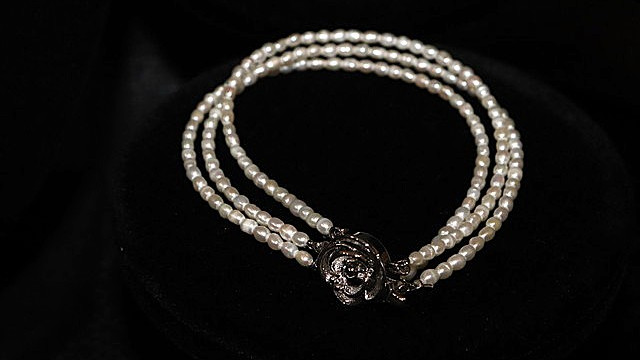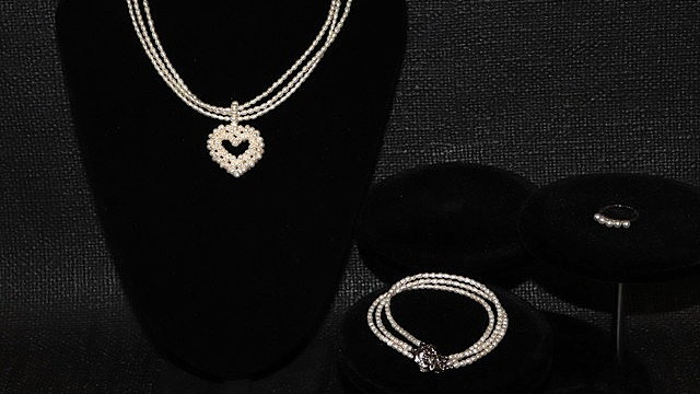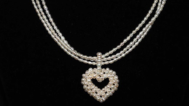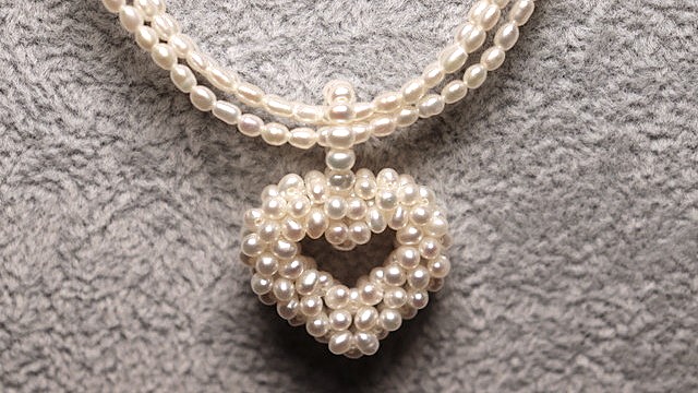 すべてがライスパールで構成の3連チェーン付きビッグハートペンダント、淡水真珠が表現できる可能性の大きさを知った