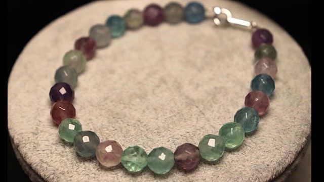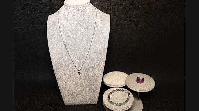 寒色系でまとめるジュエリーコーデ例、フローライトブレスレットの部分的なアメジストはペンダントやリングを繋げる架け橋