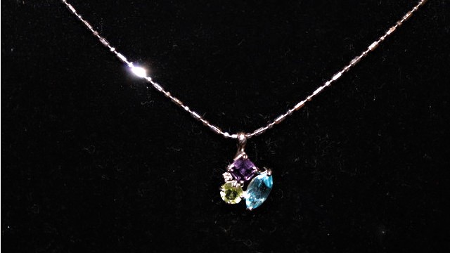 登場ストーンは、ダイヤモンド・アメジスト・トパーズ・ペリドットと全体に青味カラーでまとまるクールなペンダントトップです。