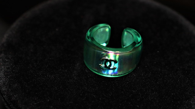 ネックレスの濃い部分のフローライトがリンクするプラリングカラーであることで、視線の偏りに対するバランスのような存在になったとこのリングの役割を考えました。