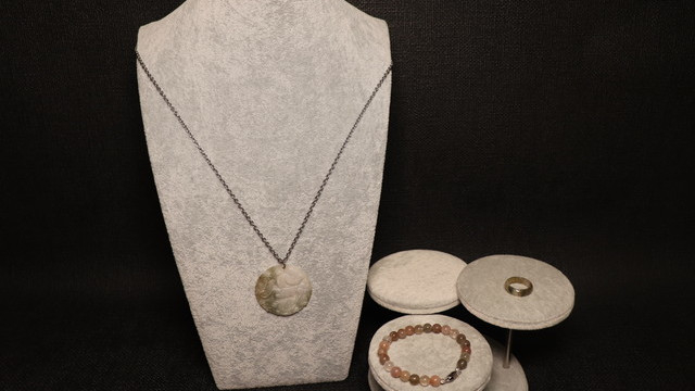 <旧57>部分的なカーキが情緒的な白翡翠ペンダント、抽象色入り混じる天然石の奇跡的な三つ揃いを生み出してくれた【325】