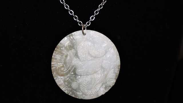 <旧57>ペンダント: 直径5cmの本翡翠。手触りがサラサラで優しい質感。龍彫り。ステンレス80cm。