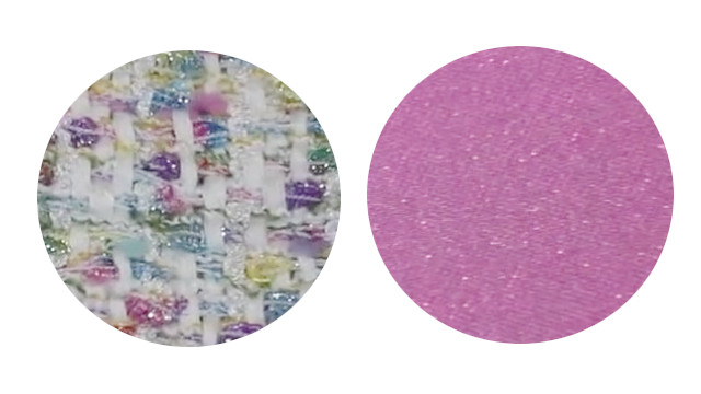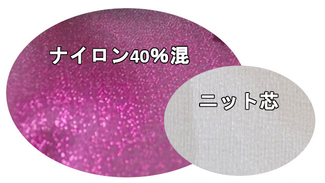 ラメツインクルサテン、ポリエステル/60%、ナイロン/40%、日本製。