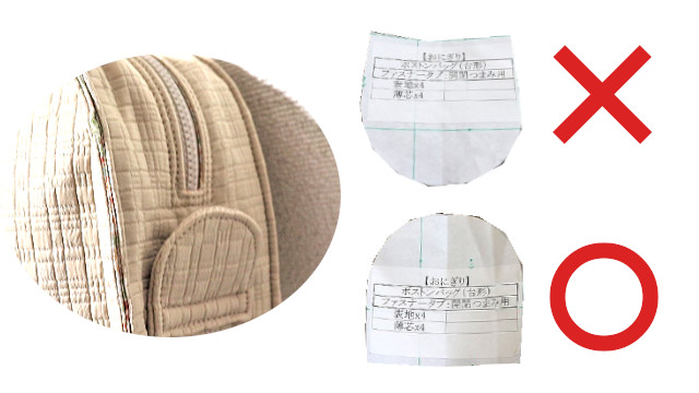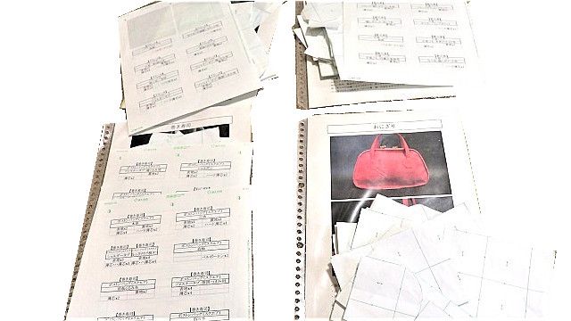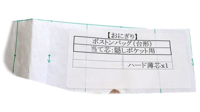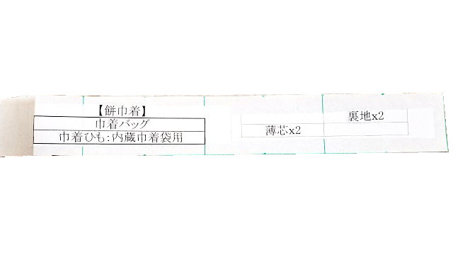 ちなみに、内容の一番上はバッグのネーミング・2段目は一般的なバッグのフォルム・3段目はパーツ項目・一番下は4つのボックス枠に左上から右下へと①表地②裏地③接着芯④不織布芯のパーツの数を記載。