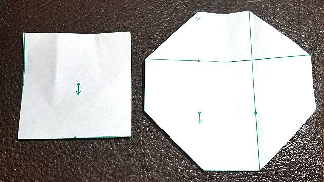 ただ、型紙に元々印刷されている5cmごとの格子状のラインと、その半分の2.5cmにある点と矢印マークは全く同様に載っているので、用紙の材質の違いだけです。