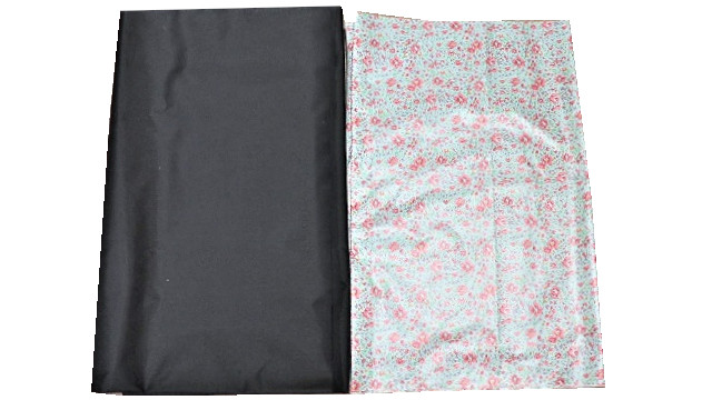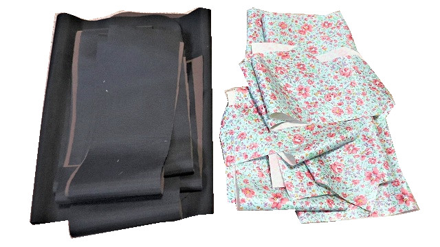 黒のナイロンオックス撥水生地とブルー系小花柄の撥水生地のコンビが素敵、接着芯貼りのポイントはニット芯の使用と粗裁ち