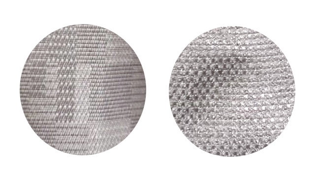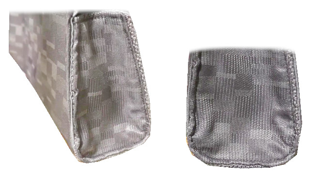 使用生地(グレー):左は完成品、右は途中の失敗のもの。いずれもカーテン地、ポリエステル/100%、日本製。