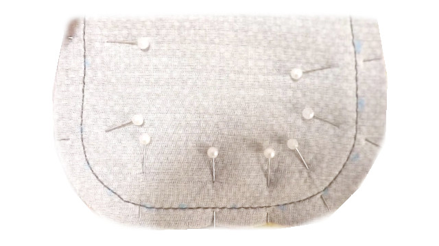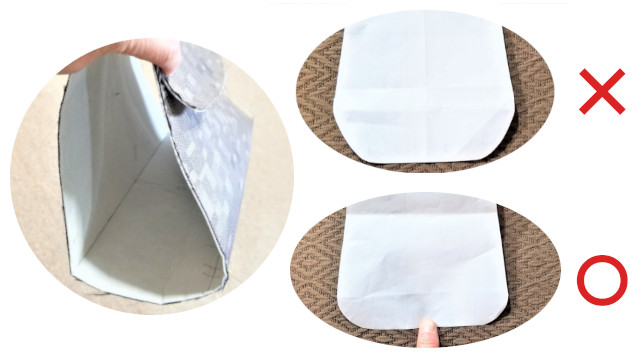 本体(左上)は早期に取っ手を付け「中表」返し。側面(右下)は「中表」返し後本体と「外表」で組み立て。