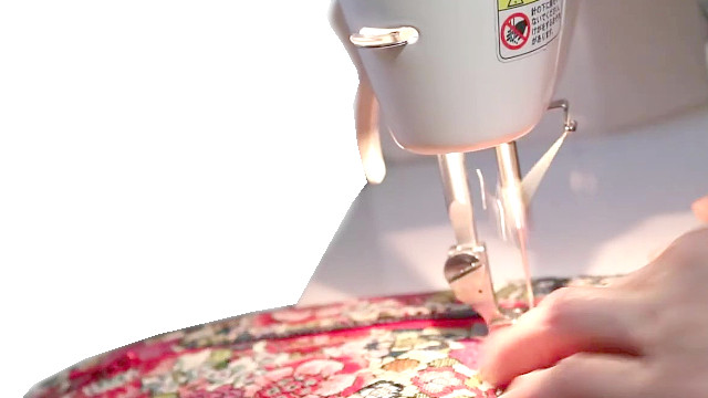本格的ゴブラン織生地でバニティーバッグを製作、最終局面の底面付けにおける背面の重なりで糸が飛んでしまったところが極限