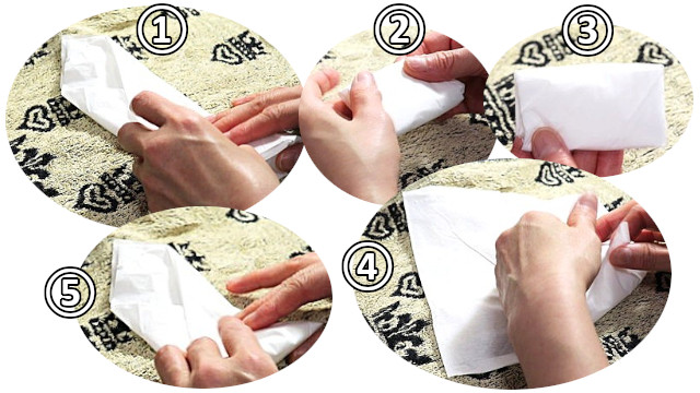 「鼻水パッド」:①-③の手順でティッシュ2枚を長方形に包み折り、④-⑤で最後の1枚を最後の包み折り。
