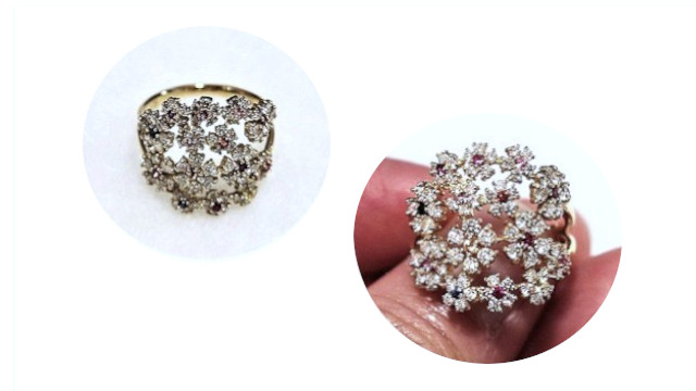 花びらがカラーストーンで中心がダイヤモンドとは反転、花びらがダイヤモンドで中心がカラーストーンの透かしブーケリングの更なる個性
