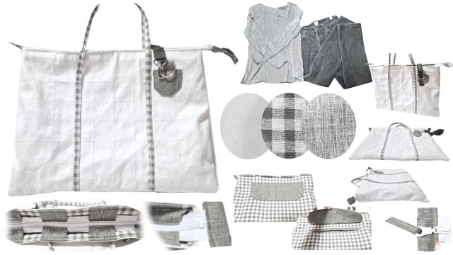 大きい面積の残布・定番モデルでは表地と裏地のコンビが見つからなかった余り生地を集め、新たにその中から改めてコンビを見つけています。