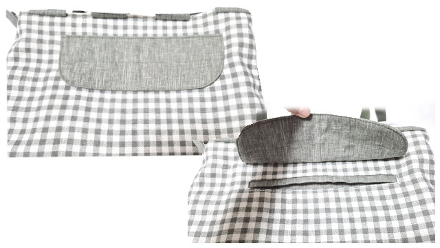 裏面のポケットのコントラスト:大人の可愛さを表現、カーキ色が白とのコンビで良きセピア色の世界観を演出。