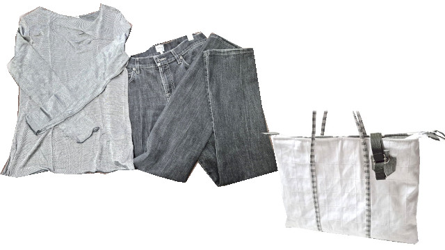 お洋服とのコーデ例:グレーイッシュな濃淡はバッグのセピアカラーに良き相性。黒が入らない優しい表現です。