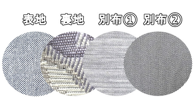 使用生地(全4種):表地(ブルー)-ダンガリー、綿/100%、日本製。裏地(マルチ迷彩柄)-生地名不明、混率不明、原産国不明。別布①(ライトグレー)-先染コットン、綿/100%、日本製。別布②(シルバーグレー)-綿ポリ混ストレッチツイル、混率不明、原産国不明。