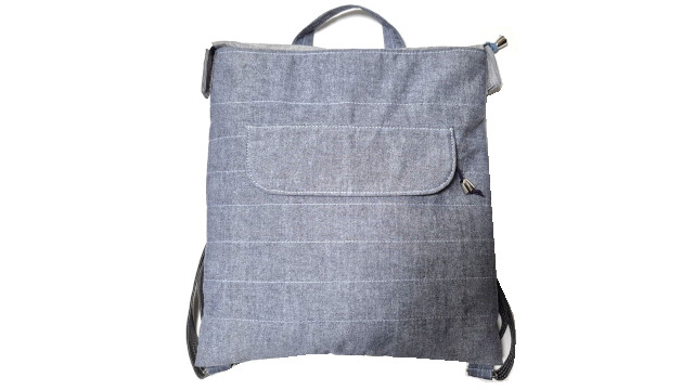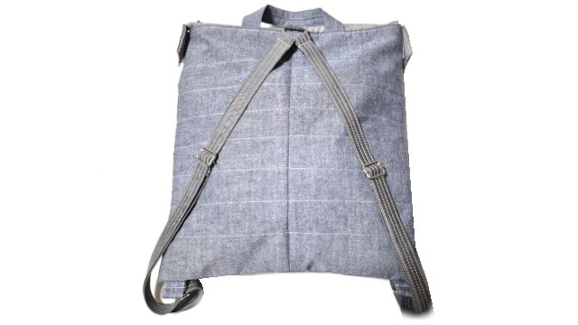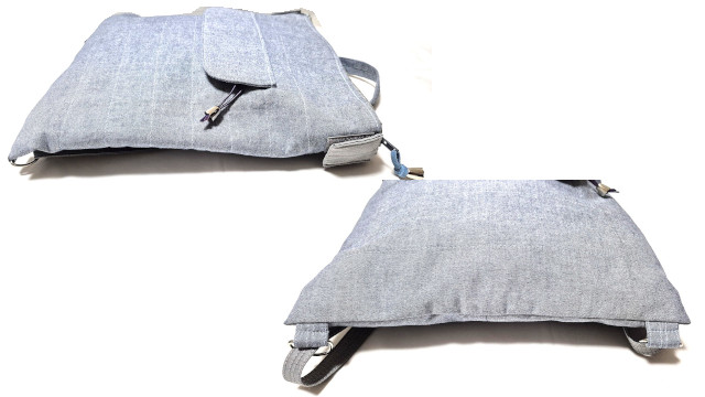 A4マチ無しリュック完成(ダンガリー):<サイズ>縦36cmx横34cmxマチ無し。ショルダーは、幅2cmx42/80cm。