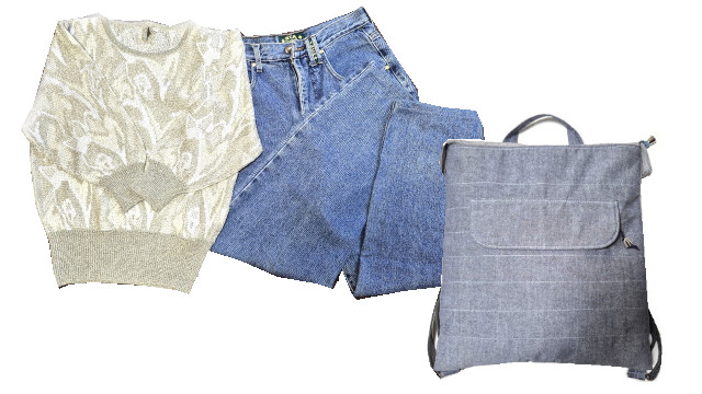 お洋服とのコーデ例:青味繋がりでライトなカーキグリーン濃淡の抽象柄のセーターとミドルデニムコンビ。