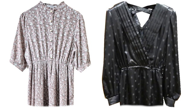 確かに左のピンクのようなスタンド襟+フリルのワンピースも昭和時代の古着にも多いですが、「流行のらせん状の繰り返し」から見ると、「ヴィンテージっぽさを取り入れたここ最近のモデル」という見方です。