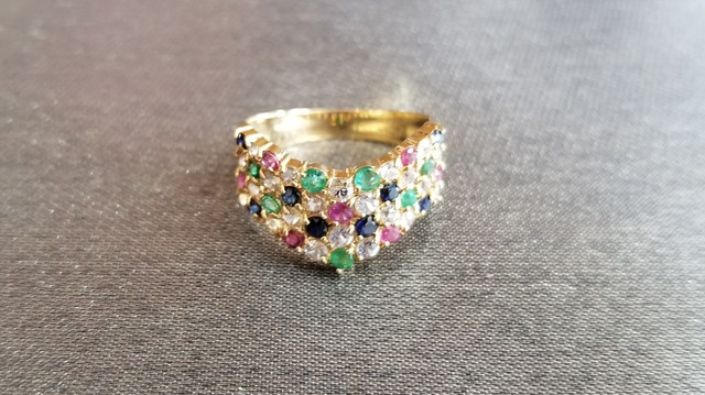 <新40>リング:K18YG台のV字14号。透明はホワイトトパーズ。その他はルビー・エメラルド・サファイア。