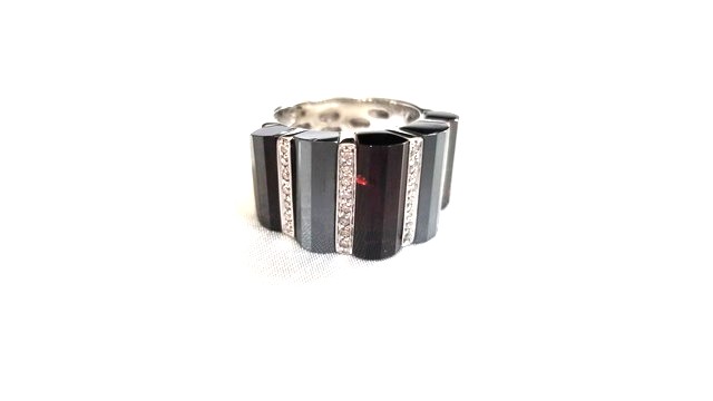 <新新16>リング:K18WG台、ヘマタイトxガーネットxダイヤモンド、ストライプ、13号、最大幅23mm。