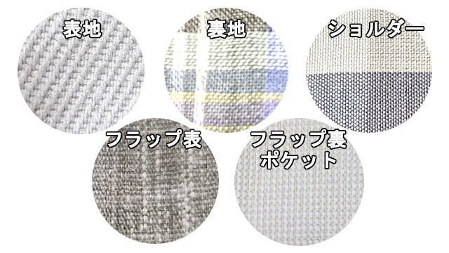 ②裏地・巾着ひもホールタブ(ブルー系ミックスチェック)、先染めリネン、麻/100%、原産国不明(おそらく日本製)。