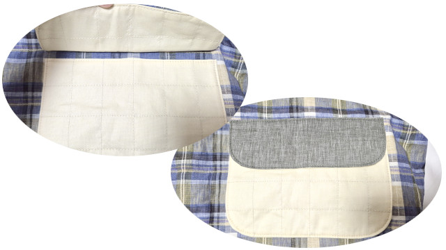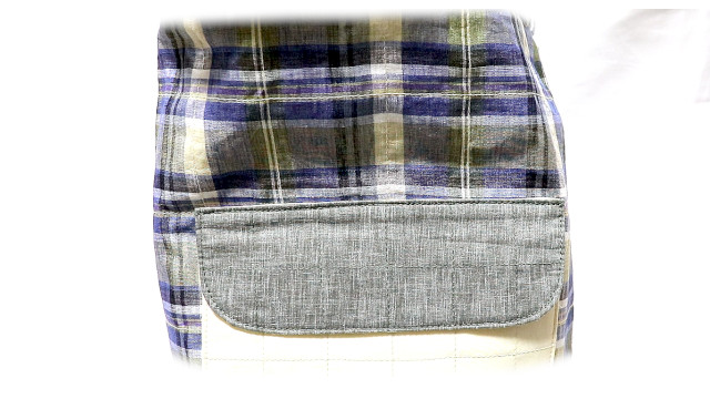 ストライプ・ボーダー・チェックのいずれのキルトであっても、予めポケット口の切り込み部分を確保しておけば「片玉縁風」と呼ぶシームタイプのポケットも可能です。