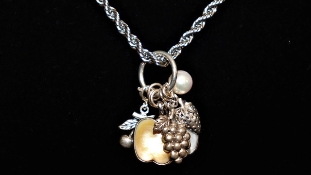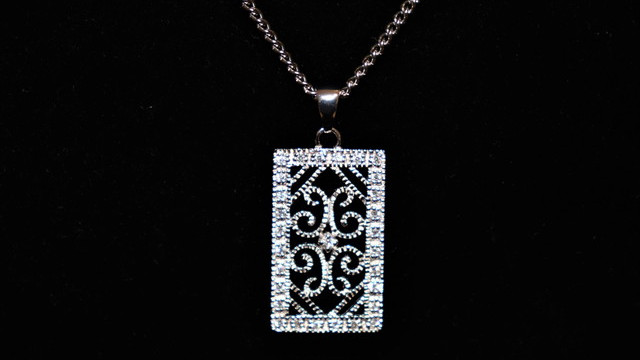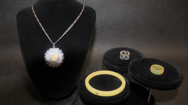 お花や鳥がのどかに彫られた小判型の透かし翡翠ペンダントをとりまく他のジュエリーの決め方