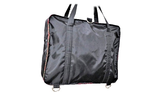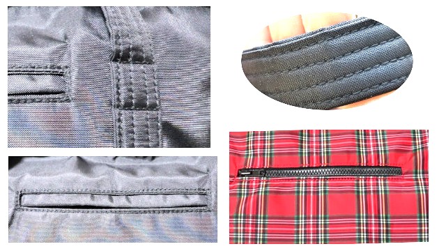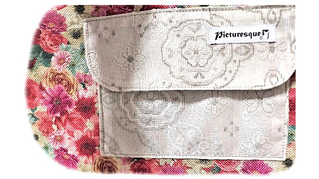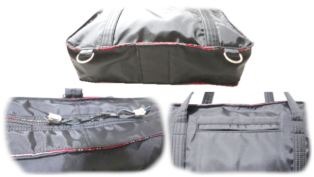 コンビは、ナイロンオックスの撥水加工の生地の黒色を表地に、そして、ポリエステル/100%の小花柄がかわいいつるつるした裏地とで内側に広がる世界の素敵さを秘めたバッグです。