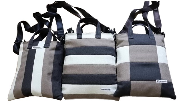 無彩色カラーの3色展開のオフ・モカ・黒すべてを調達、3色が同時に登場するバッグをイメージし、まずこのたびは、ストライプパッチワークでショルダーバッグを製作。