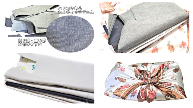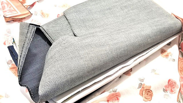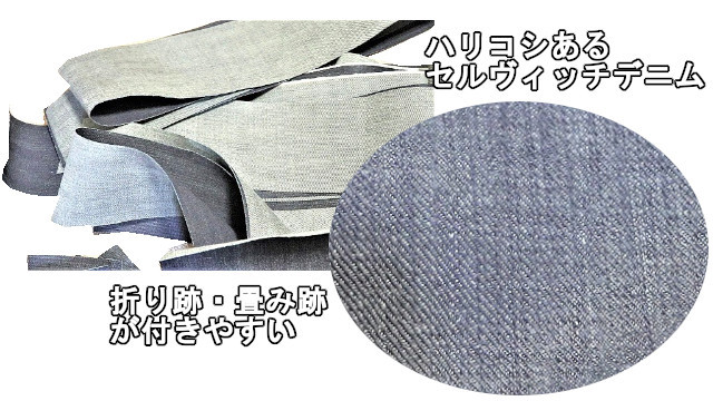 二つ折りよりも三つ折りの方が折り跡を避けふんわり畳んだ収納ができる、広い面積のデニムパーツの裁断後の優しい保管